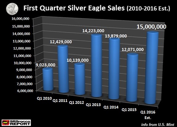 Total Silver Eagle sales in 2016 could easily reach 50 million and possibly 55 million if demand remains strong for the remainder of the year.