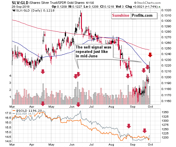 A few days after the initial spike in the ratio of volumes, we saw the repeat of this signal along with a move higher in the SLV to GLD ratio itself. That was a perfect confirmation. Yet, instead of declining right after that move, we saw a move higher… And another screaming signal. The ratio of volumes was not extremely high, but the price ratio jumped dramatically. Seems like a game-changer? It’s not – we saw the same thing in mid-April and mid-June. In fact, the mid-April rally in the ratio was even sharper.