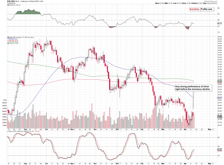 Speaking of the big slide, we previously emphasized how similar the current situation is to what we saw in 2013 right before the huge April downswing. Consequently, the question arises, if the current action in silver is anything like what we saw in 2013?
