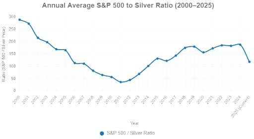 In recent years, this ratio hovered near 180:1. But silver has dramatically outperformed the index in 2025 and currently resides near 118:1.