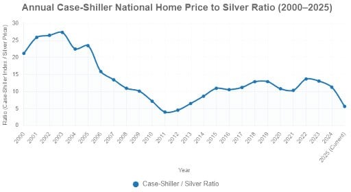 Now, let’s take a look at silver prices versus the price of residential real estate. The chart below plots average annual silver prices versus the year-end Case-Shiller National Home Price Index for each year.