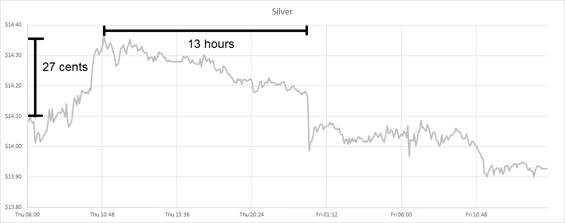 We expected it to be a teaser for today’s Report. However, the silver market took back the entire price move, and more, in about 13 hours. Here is a close-up, showing Thursday morning (Arizona time) through Friday around noon.