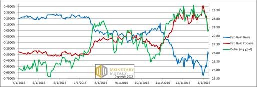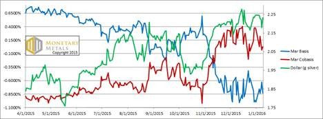 For each metal, we will look at a graph of the basis and cobasis overlaid with the price of the dollar in terms of the respective metal. It will make it easier to provide brief commentary. The dollar will be represented in green, the basis in blue and cobasis in red.