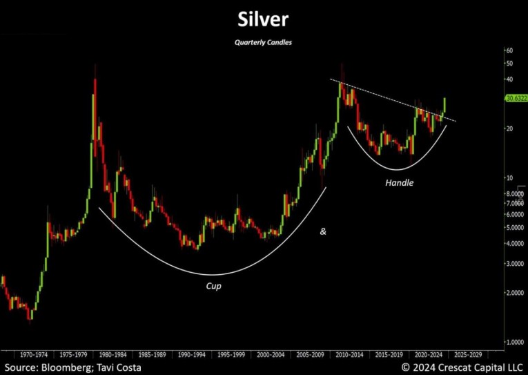 Silver in US-Dollar, quarterly chart as of May 19th, 2024. Source: Tavi Costa