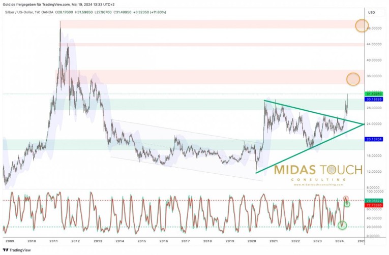 Silver in US-Dollar, weekly chart as of May 19th, 2024. Source: Midas Touch Consulting