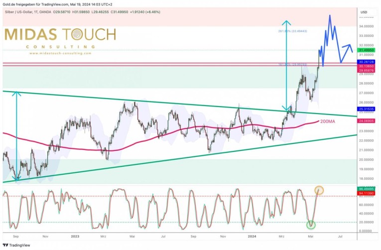 Silver in US-Dollar, daily chart as of May 19th, 2024. Source: Midas Touch Consulting