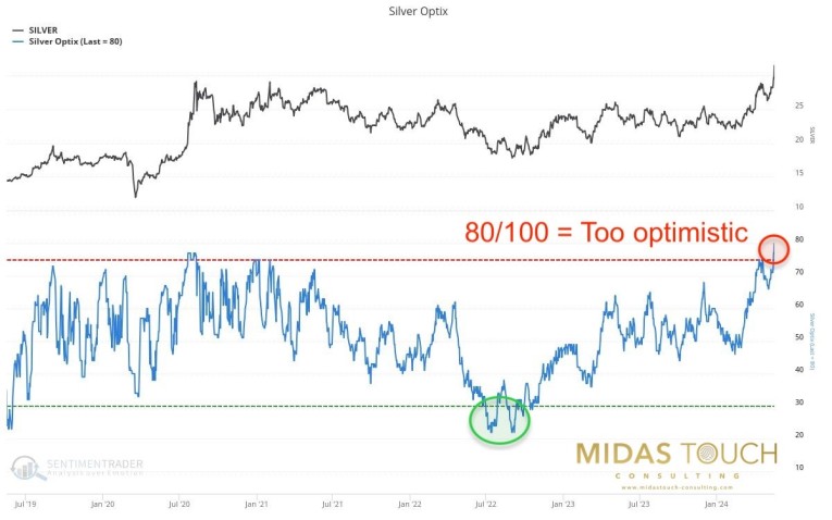 Silver OPTIX sentiment, as of May 17th, 2024. Source: Sentimentrader