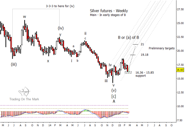 The long-term chart below presents a rough sketch of where we think silver prices will go from here. After a completed three-wave corrective move, we are fairly confident in expecting a substantial rally in the near term. In the larger picture, there is less certainty about whether the downward [a]-[b]-[c] pattern represented all of the correction or merely the first part. We are provisionally expecting another downward phase to begin sometime during the second half of 2015, based on analysis we have done for the U.S. Dollar.