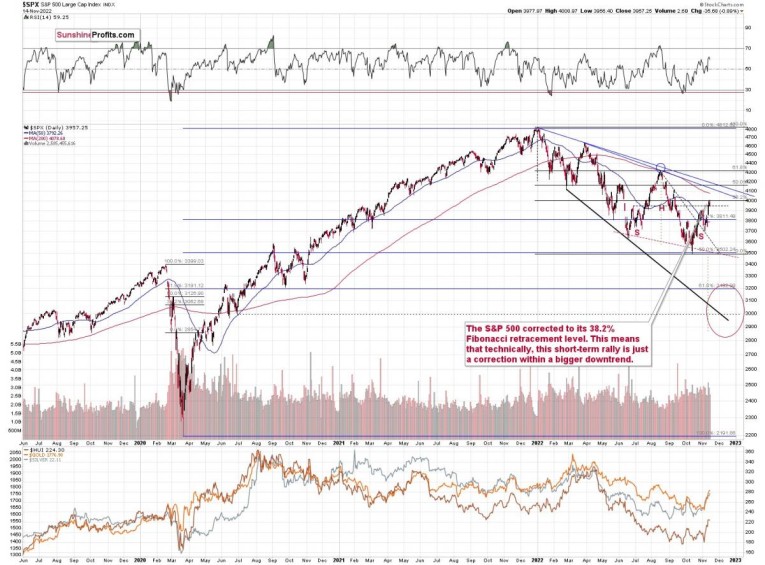 Indeed, stocks declined yesterday after a tiny attempt to move higher. In other words, the S&P 500 failed to rally above the 38.2% retracement, which increases the odds that the top is already in. At the moment of writing these words, the S&P 500 futures are trading slightly below 4,000, which means that there was no breakout above the above-mentioned retracement.