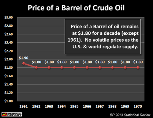 As we can see the price of oil dropped from $1.90 a barrel in 1961 to $1.80 for the remainder of the decade. That 10 cent drop was the extent of the volatility in the oil price as the U.S. and world regulated supply to keep prices at a contracted $1.80 for an entire decade.