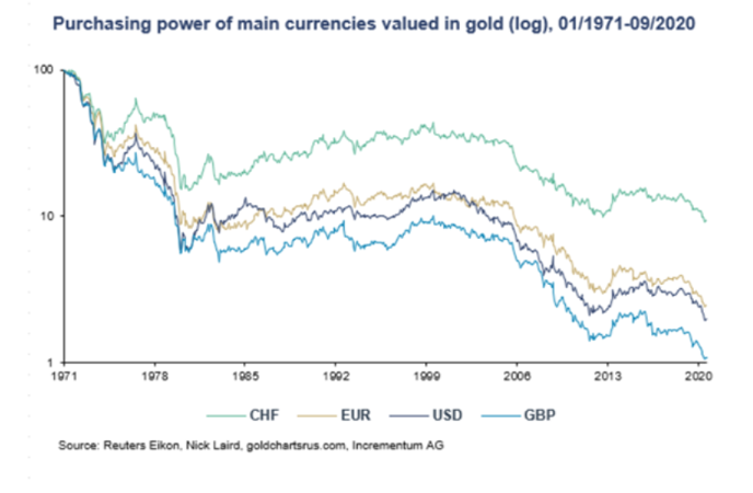 Since 1971, the fall of fiat money’s purchasing power when measured against gold has been greater than 99%.