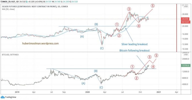 Silver was the first one to breakout of its high. Bitcoin followed suite about 108 calendar days later. If the comparison stays valid, then Bitcoin is currently moving towards a similar point 3 that silver already reached in August of this year.