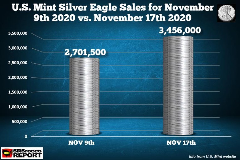 For example, Silver Eagles sales continue to be very strong in November as another 750,000+ coins were sold in the last week. The total Silver Eagle sales so far in November are now 3,456,000 versus a total of 463,000 for the entire month last year.