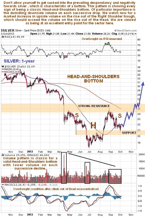 The Head-and-Shoulders bottom in silver is more obvious than the one in gold, as it is more or less symmetrical. It is not down sloping as gold’s is, and has a horizontal neckline which not surprisingly coincides with a broad band of resistance at the top of it, as we can see on the 1-year chart for silver shown below. The silver price has dropped back in recent weeks to mark out the Right Shoulder low of the pattern, which should mean that we are at an optimum buy spot right now with the price very close to what is believed to be the Right Shoulder low. It should pick up again soon and advance to challenge the resistance at the neckline or top resistance line of the Head-and-Shoulders bottom. Astute traders will recognize the opportunity inherent in this setup, for if this H&S is indeed valid, then we are clearly at an excellent entry point at this Right Shoulder low, as a major uptrend should follow, but if the H&S pattern is false and the pattern aborts, then the proximity of support at the Right Shoulder low means that stops can set immediately beneath it and positions exited in the event that it breaks lower, for a minor loss. That said, however, it is considered unlikely that this reversal pattern will abort, because the volume pattern during the development of this Head-and-Shoulders bottom is exactly what one would expect of a valid pattern, with the volume on the decline to the Left Shoulder trough being high, that on the decline to the low of the Head being less, and that on the decline to the Right Shoulder trough being less again.