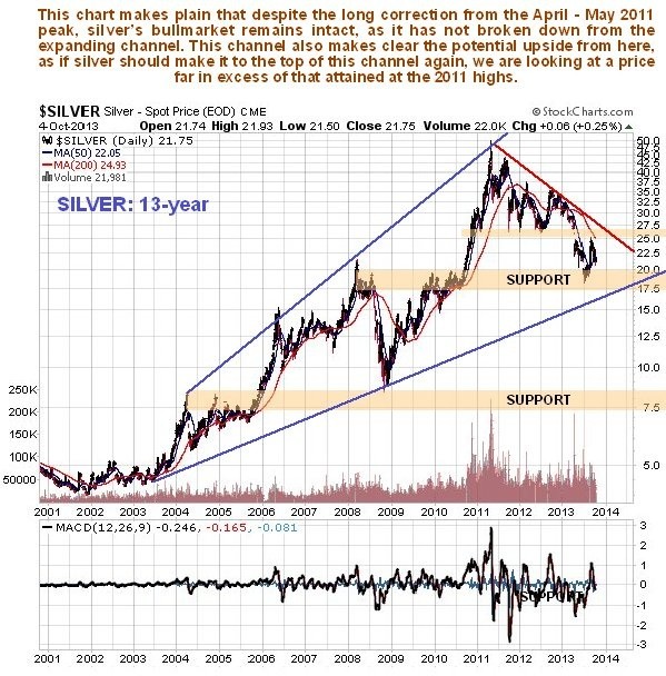 The long-term 13-year chart is, or should be, most heartening for silver bulls as it shows that the long-term uptrend remains intact and further that upside potential from here is very substantial, which should not be so surprising given that the cornered Fed has no choice but to continue with QE or even expand it, unless that is it wants to watch the markets implode and the economy collapse.