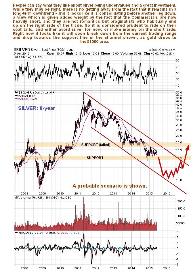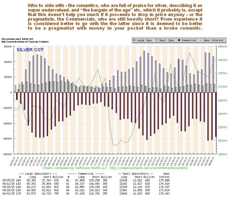 A lot of folks are waxing lyrical about silver, about what a great oversold undervalued investment it is, that is Real Money and how it is leveraged to gold and thus even better etc etc. The only problems are that it happens to be stuck in the same grueling downtrend that has driven it lower and lower for 4 years, and the Commercials are heavily short. Given that the folks waxing lyrical are romantics, and that the Commercials are pragmatists who make money nearly all of the time, you ought to be able to figure from this which side of the equation you should be on. It is not that the romantics are necessarily wrong in their positive assertions regarding silver – their problem would appear to rest with the small matter of timing.