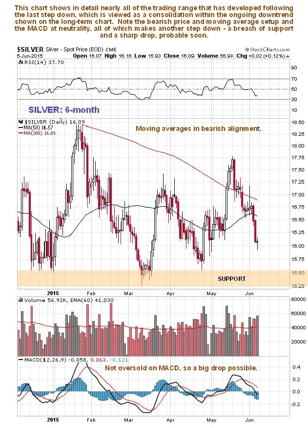 The 6-month chart for silver shows in detail the trading range that has formed this year, that is viewed as a consolidation within the ongoing downtrend shown on the long-term chart. While this chart by itself is almost useless, because “you can’t see the wood for the trees”, it does reveal how silver is coming under increasing pressure from its bearishly aligned moving averages and since it is not oversold at all on its MACD indicator, it could drop hard soon.