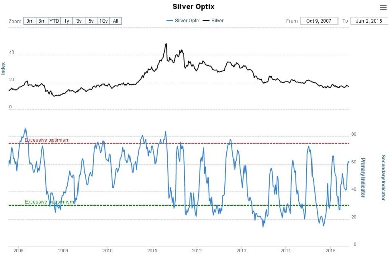 The silver optix, or optimism chart, is in middling ground with a bearish bias…