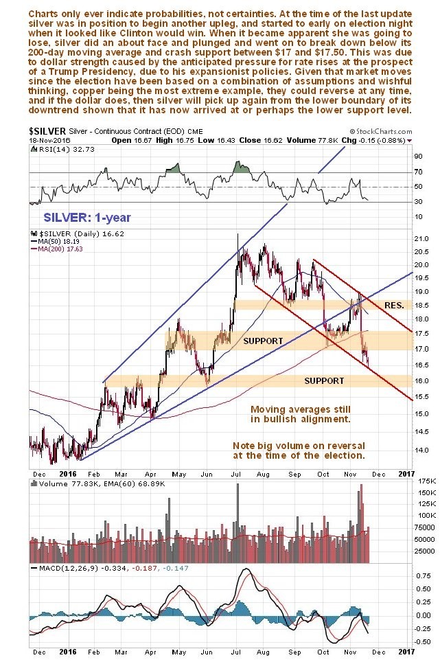 Silver had actually broken down from its uptrend at the time of last update, and well before the US election. However, it was thought to look positive going into the election, because it was ascending off an important support level and from a rising 200-day moving average, and the outcome may have been positive had Trump lost as expected, but he won, which triggered a sharp rally in the dollar and an about face and plunge in both gold and silver.