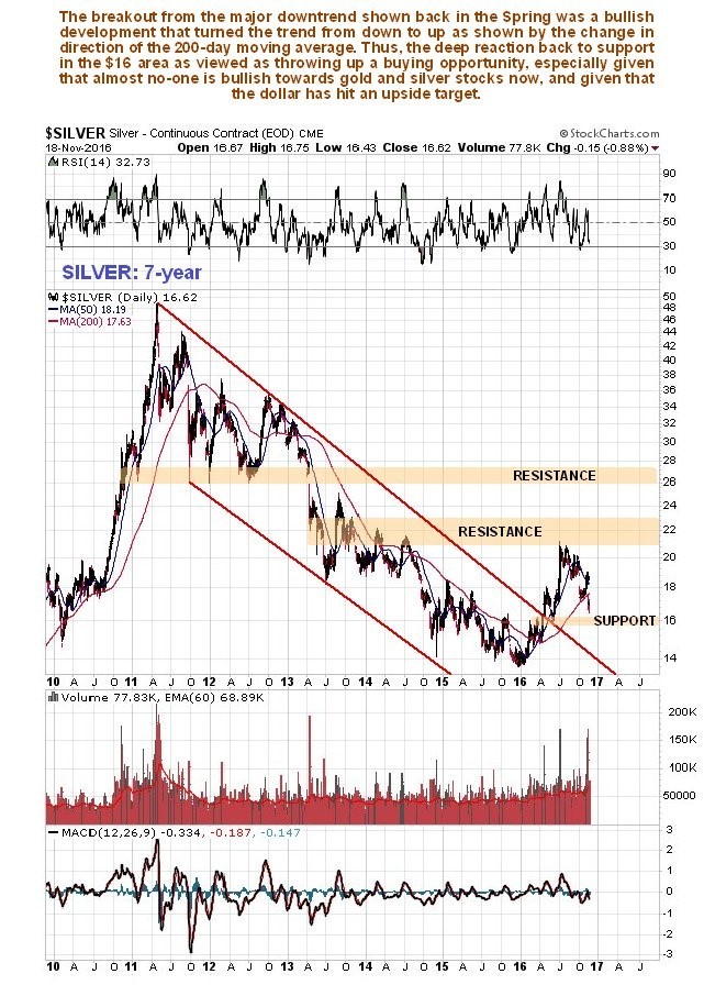 The advance by silver during the 1st half of the year is regarded as an impulse wave, or a move in the direction of the primary trend, because it broke the price clear out of a downtrend that had been in force from May 2011, as we can see on the 7-year chart below, in the process swinging the direction of the long-term 200-day moving average from down to up, the classic signal of a change in the direction of the major trend, although this does not always work – it turned up in October of 2012 at the time of a bull trap, but in this instance we have a clear breakout from a long-term downtrend. Thus, the deep reaction of the past several months back to an important support level is viewed as throwing up a major sector buying opportunity.