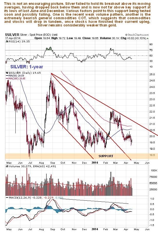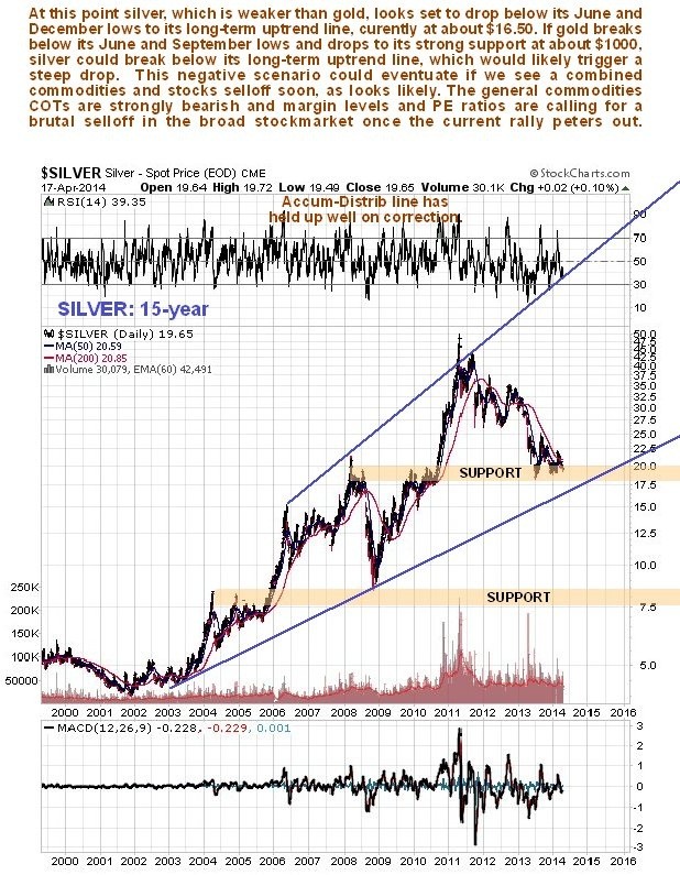 Unlike gold, silver is still some way above its long-term uptrend line, which should hold the price if gold holds above its similar long-term uptrend line, and it is here that a major reversal may occur. However, if gold should break below its long-term uptrend line and head towards its strong long-term support level at about $1000, then it is likely that silver will crash its long-term uptrend line and drop away steeply, especially given its present frail and vulnerable condition.
