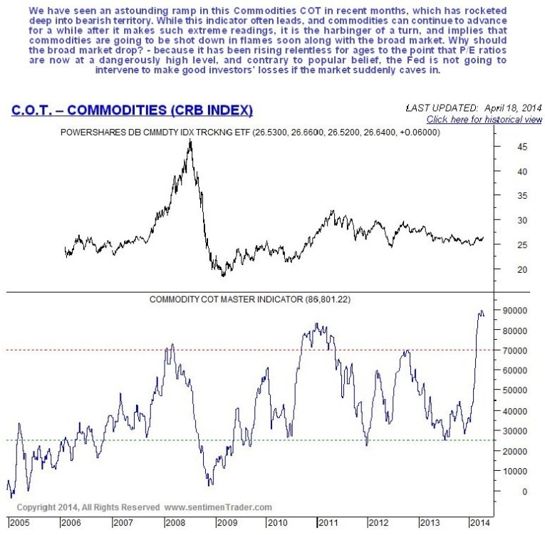 Finally we will look briefly at the latest general commodities COT chart, which shows an astounding shift in positions over the past several months. This chart has rocketed deep into a bearish extreme reading, which does not bode well for commodities as a group at all – what this implies is that commodities will be shot down in flames along with the broad market before much longer. Here we should note that this indicator can lead, and make extreme readings some time before commodities hit a peak, but nevertheless it warns of a looming serious reversal.