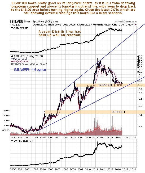 Other than the admittedly scary COT chart, the long-term 15-year chart for silver still looks good, as it is now in a zone of strong support above the support of its long-term uptrend line.
