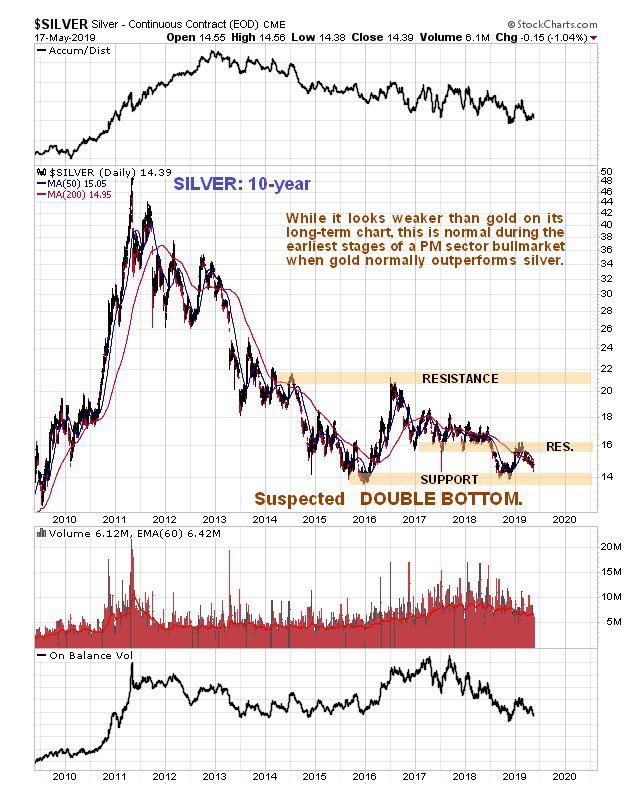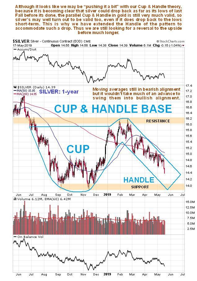 On silver’s 1-year chart it still looks like it is moving to complete a Cup & Handle base, because the pattern roughly parallels the pattern completing in gold, although the downwardly skewed Handle is driving the price back down towards the vicinity of the lows of the Cup. A breakout from the Handle downtrend will be bullish although this doesn’t look likely short-term because of adverse seasonal factors.
