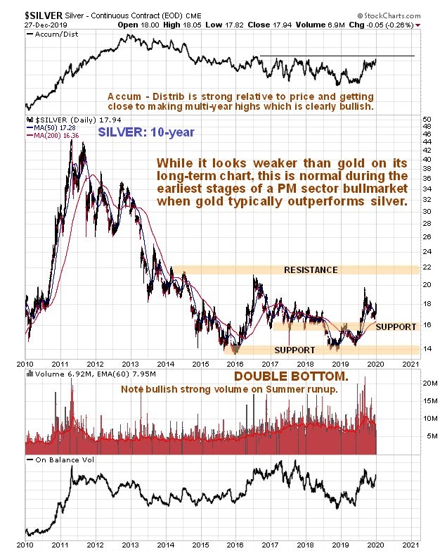 While silver’s charts do not yet look as positive as gold’s, that is normal at this early stage in the cycle, when gold is favored over silver, which attracts more speculative interest as the bullmarket progresses. Nevertheless, as we can see on the latest 10-year chart for silver below, it is starting to look a lot better as it hauls itself up out of the 2nd low of the giant Double Bottom pattern shown. Gold’s advance and Summer breakout triggered a strong impulse wave in silver, which then reacted back to support above its rising 200-day moving average. Last week it turned higher to start its 2nd impulse wave, which, given the increasing risk of the dollar dropping hard, has a good chance of making a run at the resistance level shown. Technically, it is still within the base pattern until it succeeds in breaking above the resistance at and approaching its 2016 highs. Once it does the advance is likely to accelerate.