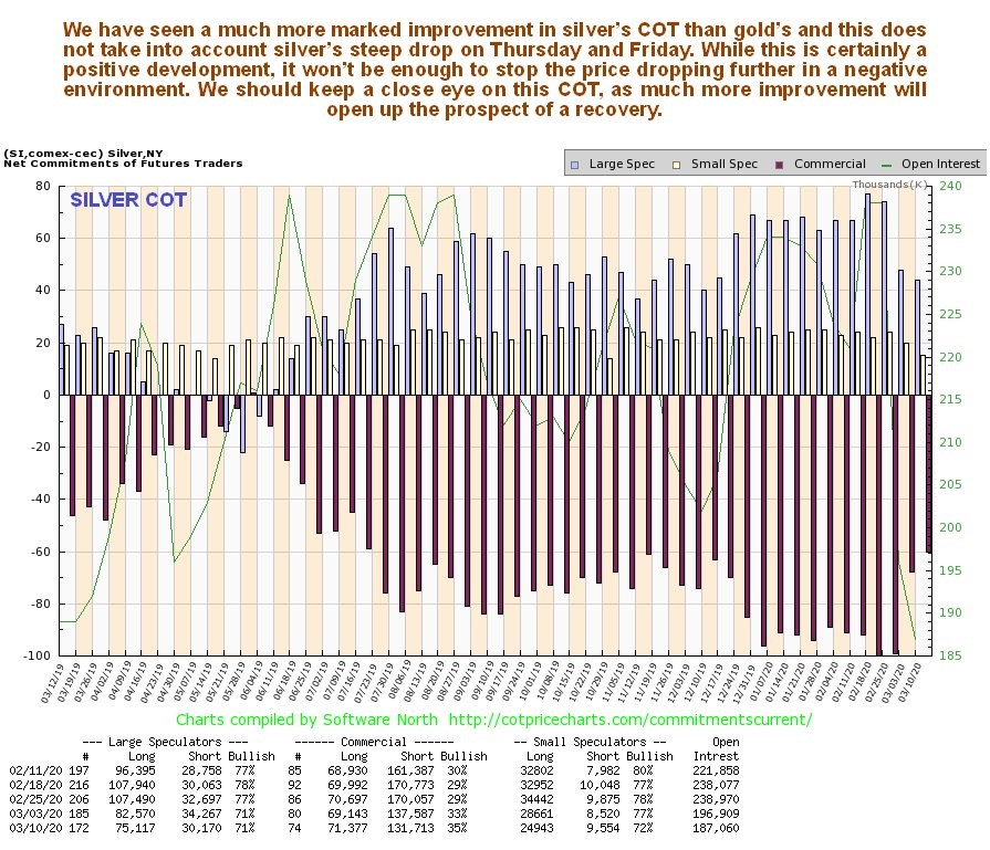 A bright spot for silver is that its latest COT chart shows considerable improvement, with the Large Specs, having had their hopes dashed again, folding their tent and heading off into the sunset, and remember that these figures are for the close last Tuesday, and so don’t take account of Thursday’s and Friday’s steep drops, so we can expect them to be better still now (and at the next showing).