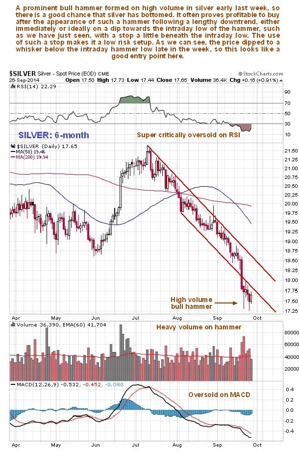 We’ll start by looking at silver’s 6-month chart, on which we can see its recent action in detail. Here we see the breakdown from the Triangle (shown on the 4-year chart below) and the resulting sharp drop. This drop is now regarded as a final capitulation following the long and grueling downtrend that preceded it.Note the pronounced high volume bull hammer that occurred early last week. There is a good chance that this marks the final bottom, and if not, we are considered to be very close to it. This hammer was followed the next day by a “spinning top” candlestick, a sign of indecision and another sign that the downtrend has exhausted itself. You may recall that it was stated in the Silver update posted on the site a couple of days ago that “Traders wanting to buy here have a low risk setup, as silver may be bought here, or ideally on a short-term dip towards the hammer intraday low, with a stop a little below the low of the hammer.” Well, the price has since drifted back to the vicinity of the hammer low, and on Thursday dropped to a whisker below it intraday, and this may turn out to be a near perfect entry point. Before leaving the 6-month chart, note how horribly oversold silver is on its short-term oscillators after its prolonged downtrend, especially its RSI which shows it to be super-critically oversold.
