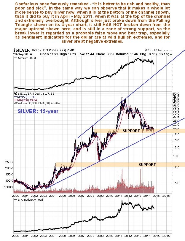 The 15-year chart presents the other side of the story, as it reveals that silver has still not broken down from its long-term uptrend in force from 2003 and is still in a zone of major support arising from the extensive trading in this price zone in 2008 and again in late 2009 and 2010. This chart makes plain that while silver has certainly been in a bearmarket from April – May 2011, in the larger scheme of things this may only be a severe correction within an ongoing major bullmarket.