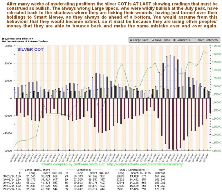 The standard silver COT is now most encouraging. It shows that at last positions have eased to a low level that must be construed as bullish. The formerly enthusiastic Large Specs, who are always wrong, have given up and are out.