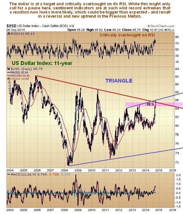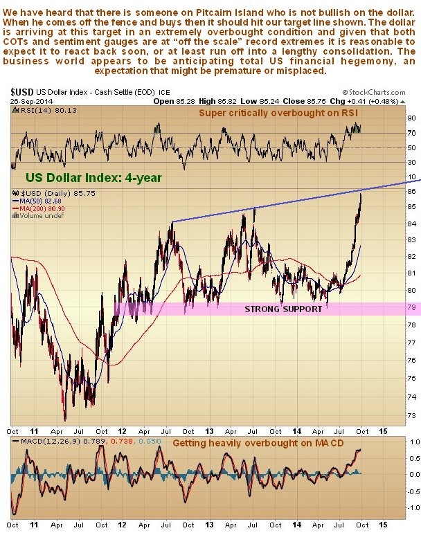 The 4-year chart shows to advantage the dramatic spike in the dollar index, which has resulted in it arriving at the target shown in a wildly overbought state. Thus it is now vulnerable to a sudden reversal.