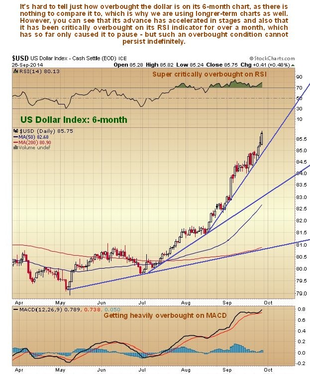 The 6-month shows recent action in detail, and how the dollar’s advance has ramped up in stages. The RSI indicator at the top of the chart shows that it has been critically overbought for over a month, a situation which cannot persist indefinitely.