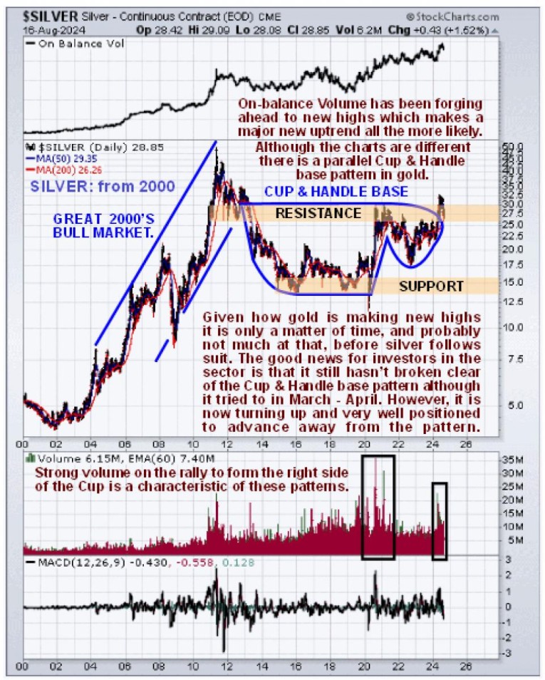 The big difference here between silver and gold is that, while gold has already broken out and is forging ahead, silver has so far only managed a “preliminary” breakout that was followed by a reaction back into pattern, but with gold striding ahead this is not a situation that can be expected to last much longer and it is already starting higher. WHAT THIS MEANS IS THAT SILVER AND ALL THINGS SILVER ARE A TERRIFIC BARGAIN HERE WITH THESE SORTS OF PRICES NOT EXPECTED TO LAST MUCH LONGER, AND MAY NEVER BE SEEN AGAIN. That the giant Cup & Handle base shown on our long-term chart for silver going back to 2000 is valid is made clear by two important technical factors. One is the strong volume on the rally to form the right side of the Cup in 2020 (and on the attempted breakout this Spring) which is a sign that the pattern is genuine and the other is the strong On-balance Volume line which has been marching steadily higher. Thus the reaction back into pattern of the past couple of months is seen as presenting the perfect “buy spot” for silver and all things silver ahead of a genuine breakout leading to a vigorous bull market especially given the serious escalation of military conflict in different theaters around the world that we are now right on the verge of.