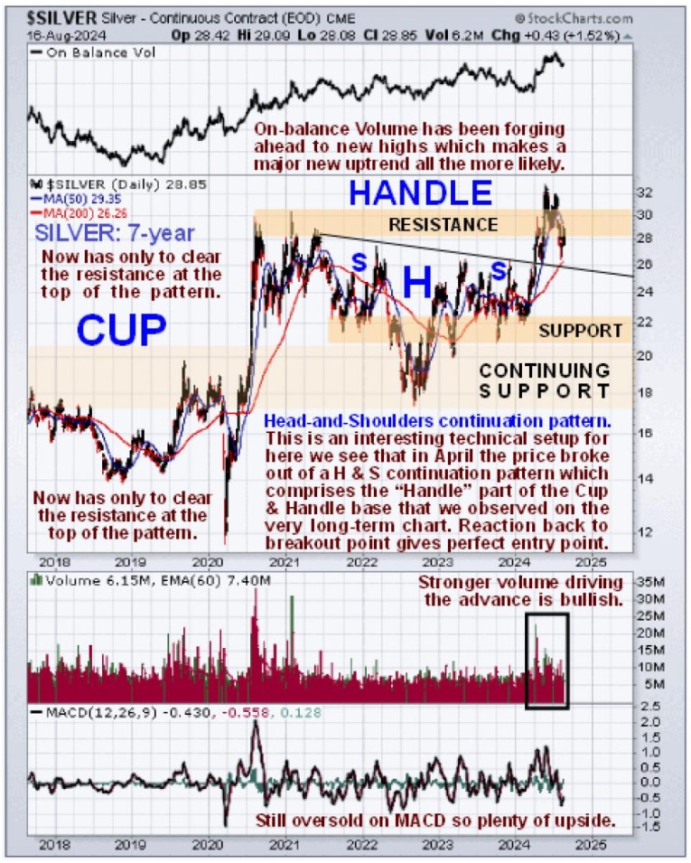 Zooming in now via a 7-year chart, which shows the right side of the Cup and the subsequent “Handle” in much more detail, we can see that the Handle has been comprised of a Head-and-Shoulders continuation pattern with the price staging a clear breakout from it in April, in sympathy with gold’s advance, and this breakout has been followed by a normal reaction back to a classic “buy spot” at support at the upper boundary of the H&S pattern and although it is starting to advance again, we are clearly in a very good buying area here with silver still oversold on its MACD. After the price broke out in April it drove through the key $30 level, but due to overhead resistance – recall that silver got as high as $50 in 2011 – and due to it having become overbought, it reacted back below it again. However, this was not in any way a negative development as it was simply a normal post-breakout reaction back to test support and the foray about $30 drained off some overhanging supply thus clearing the way for the next upleg to make more progress.