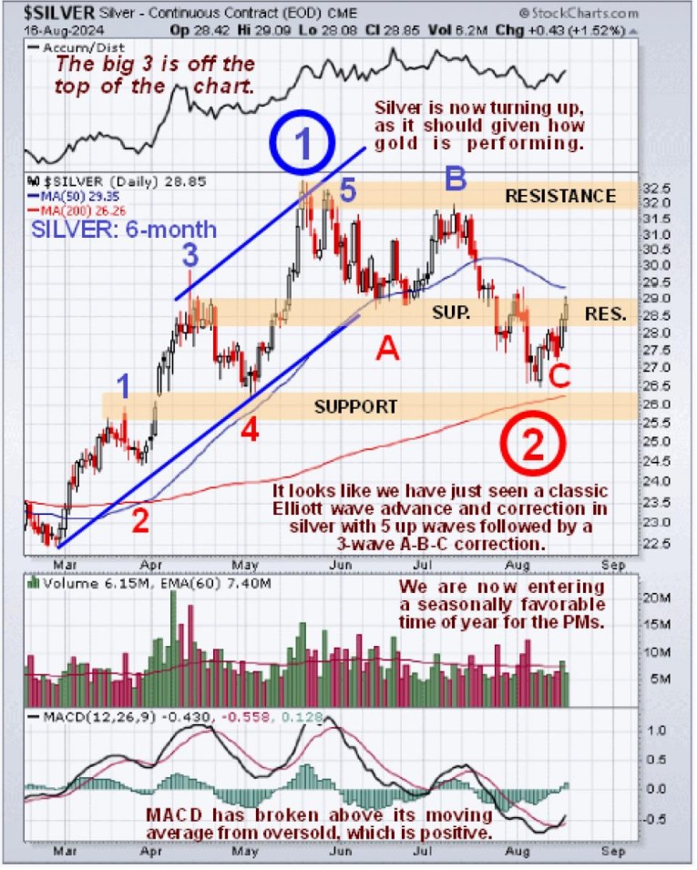 Lastly on its 6-month chart we can see how silver is perfectly positioned for renewed advance following a normal correction back to support in the vicinity of its rising 200-day moving average. We don’t often attempt to employ Elliott Wave Theory because it can be complicated and tricky and has a tendency to work very well in retrospect but on this occasion we see that silver has exhibited a near-perfect 5 waves up in the direction of the primary trend followed by a 3-wave correction which are believed to be waves 1 and 2 of a larger order uptrend. If so then big wave 3 is imminent which is likely to be substantial.
