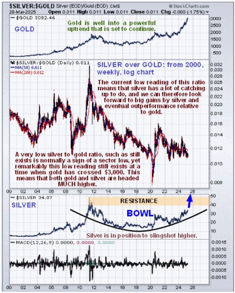 Alright, so how much speculative froth is there in this market? – after all, you might expect some given how much gold has risen over the past year, right? - but the answer is that there is none, zero, nada – the retail investor is not involved in the PM sector at all yet – they are still trying to make money in the crypto market or in Tech stocks like Nvidia. How do we know there is no speculative interest? - simple - from the silver to gold ratio. Take a look at the following chart for the silver to gold ratio, also from the year 2000 and you will see that it is still at levels that we associate with major sector lows!! It is even below the reading it was at ahead of the great 2000’s PM sector bull market and at the 2008 market crash lows when the sector got taken down with everything else. The only time it got significantly lower than where it is now was during the orchestrated Covid mass psychosis event of the Spring of 2020 when the masses thought that the world was coming to an end. What does this mean? – it means that the upside for the sector from here is massive – this thing has barely gotten started yet.