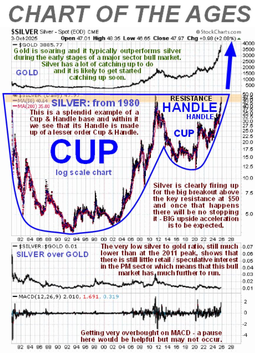 I want to commence this update on silver by pointing out something that is actually rather amazing. Despite its impressive gains of the past several months, the massive bull market that is soon to unfold before us hasn’t even started yet. You will understand why I say that when you look at the great “Chart of the Ages” presented below. This chart shows that silver is now very close to completing an epochal 45 year Cup & Handle base pattern and while it could yet take a month or two to complete its break out from it, what’s a month or two after 45 years??...