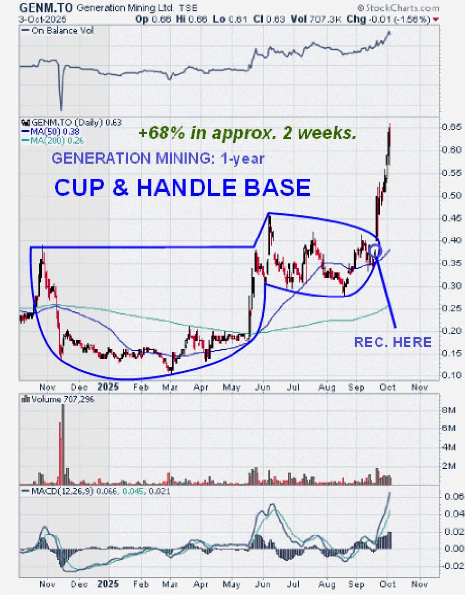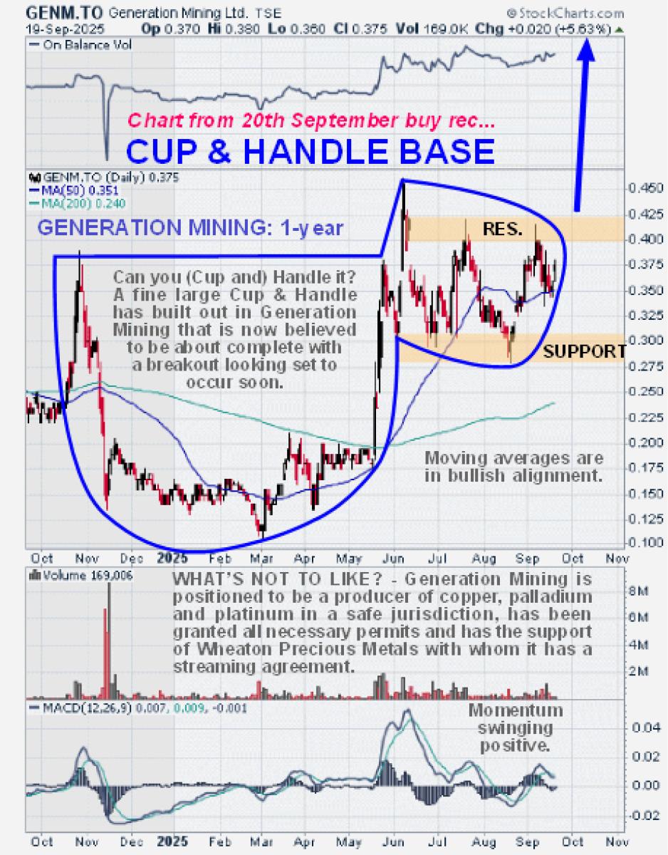 Bought Generation Mining on 22nd September, recommended at C$0.375, gapped to C$0.40 at open…