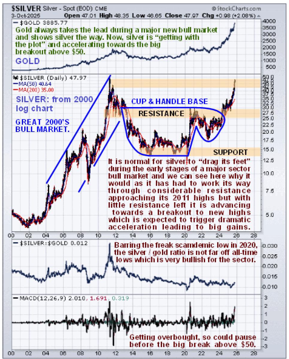 Now we will zoom in to consider the latter part of the Chart of the Ages by means of another long-term chart, this time “only” going back to the start of this millenium, i.e. to the start of the year 2000. When we look at these two charts together we realize that the great 2000’s PM sector bull market saw silver rally to complete the right side of the enormous Cup & Handle base shown on the 45-year chart and therefore, despite that big powerful uptrend in silver that ran through the 2000’s resulting in impressive gains, it still hadn’t broken out of the gigantic base pattern shown on the 45-year chart! and the great news for investors here is that it will achieve this feat before much longer. Before leaving this chart from the year 2000 observe how silver’s rate of advance has accelerated in recent months which is because there isn’t much resistance left to overcome before it breaks out to clear new highs. We should note however that it is already quite heavily overbought (MACD) so we could see a final near-term consolidation / reaction before it makes a clear breakout that is designed to shake people out before breakout occurs.