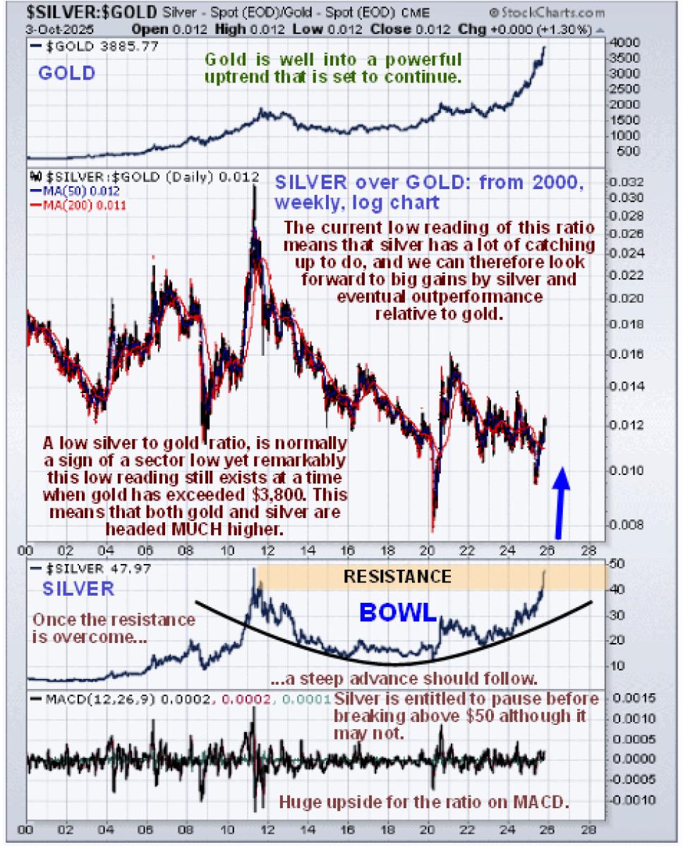 Now, this is important. The bull market resulting from the breakout from this giant pattern will be at least equal in extent to the height of the pattern from top to bottom measured on this log chart. What this means is that silver is headed into the hundreds of dollars – could be $300, could be $500 or much higher, the exact figure doesn’t matter – what matters is that silver investments such as the stocks of silver producers are going to moonshot as a result, and that could happen relatively quickly. Before moving on from this chart there are a couple of other important positive points to note. One is that gold, shown at the top of this chart, is already rocketing higher, and where gold goes silver follows and it is very clear that the positive action in gold will encourage silver to get on with it and break out of this pattern before much longer. The other important point is that the silver to gold ratio, shown towards the bottom of the chart, is still at a low level – much lower than it was at the 2011 sector peak – which means that this bull market still has much further to run.