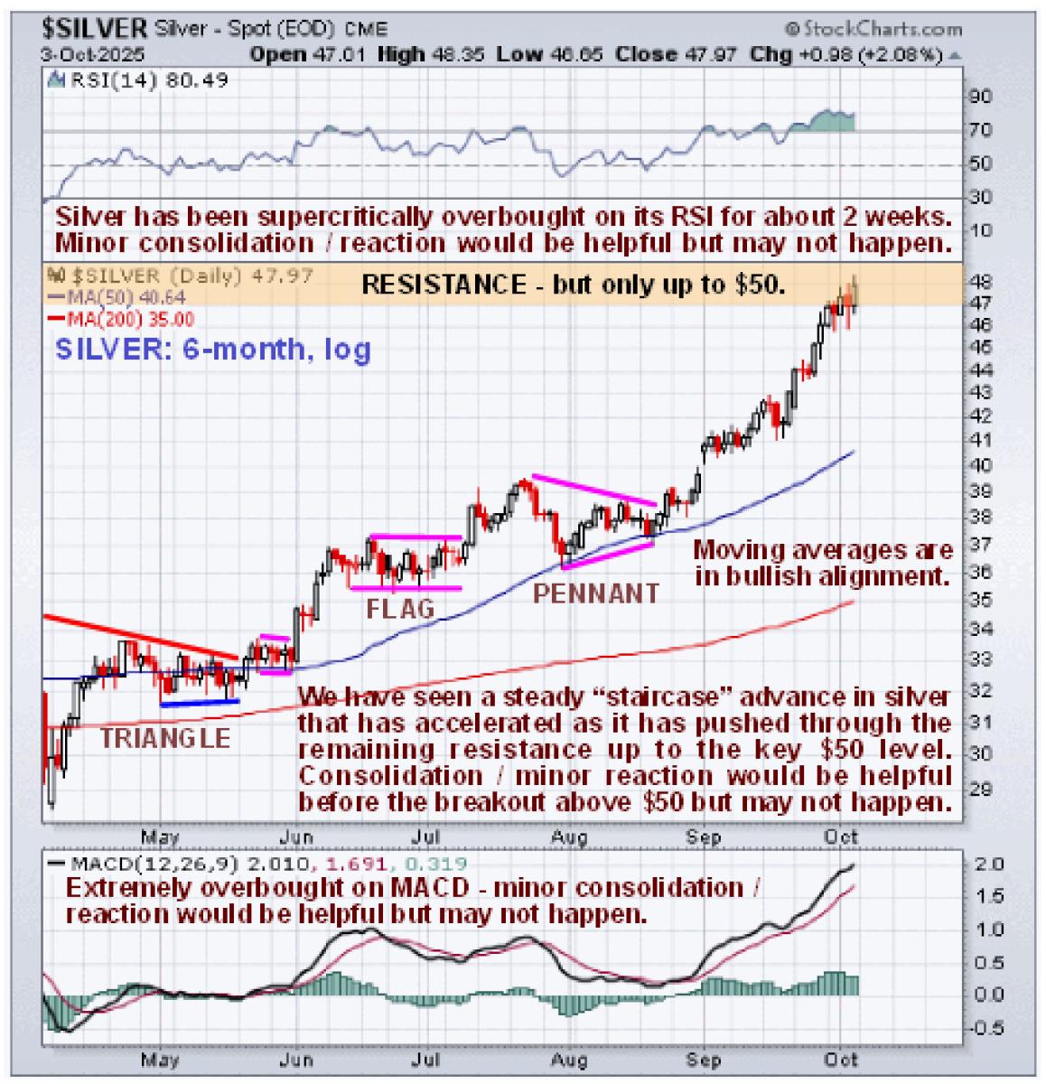 Zooming in yet again via the 6-month chart enables us to see recent action in detail. Here we see that the picture is entirely bullish with silver having been advancing in a “staircase” pattern towards the key resistance at the $50 level, the only reservation being that it has arrived at this resistance in a heavily overbought state, on its RSI indicator which has been in a super-critically overbought condition for about 2 weeks and on its MACD indicator with a large gap having opened up with the 200-day moving average, all of which increases the risk of a period of consolidation / reaction, which as mentioned above would be a healthy development ahead of the big breakout and if there is a reaction it would present a great opportunity to buy or add to positions.