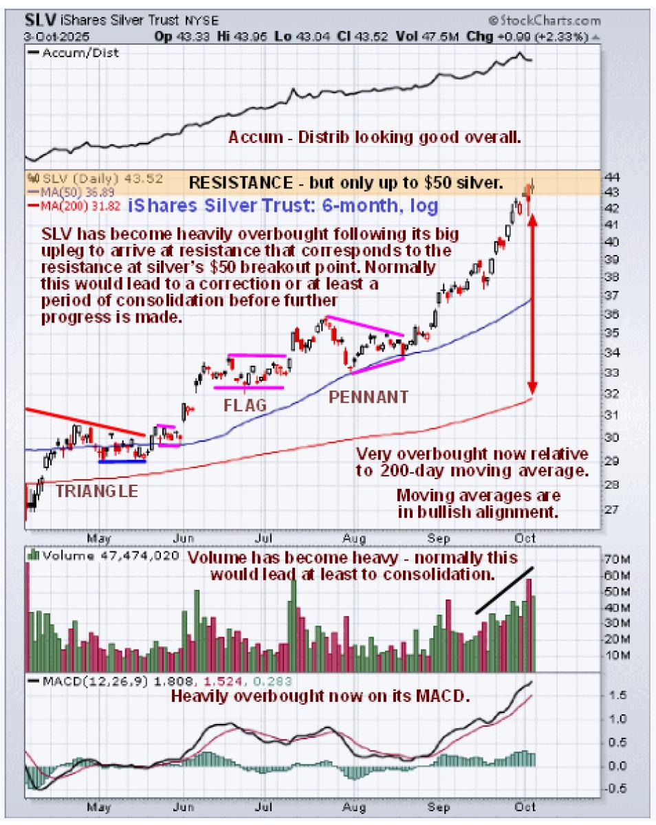 The 6-month chart for silver above lacks volume and as a result, volume indicators but we can get around that by looking at the 6-month chart for reliable silver proxy iShares Silver Trust (SLV). On this we can glean the additional information that volume has built up to become quite heavy over the past several weeks which also makes a period of consolidation / reaction more likely.