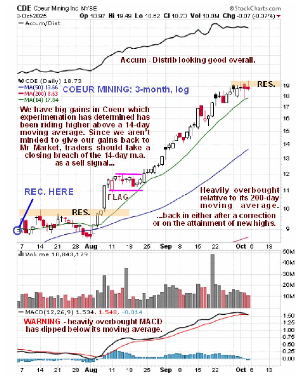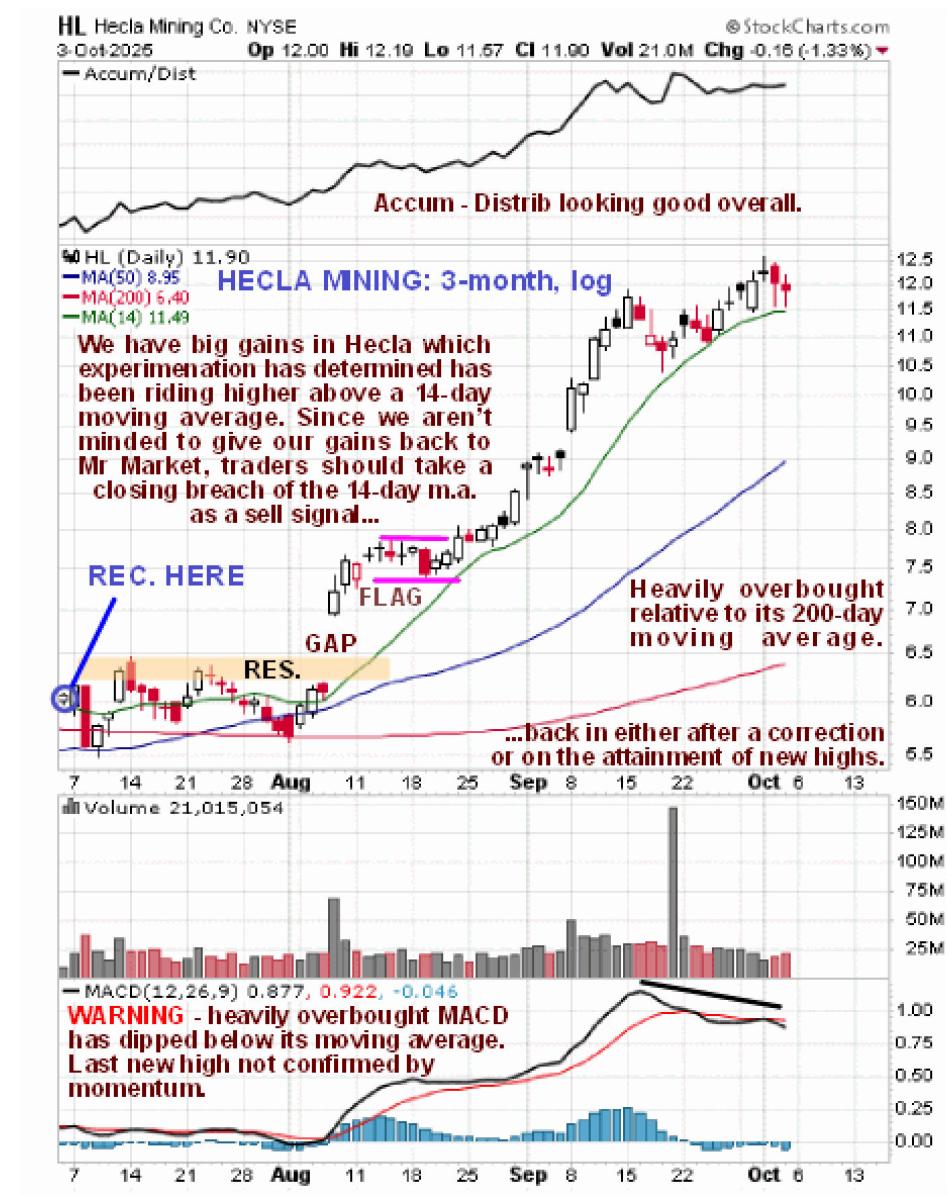 So what can we do to make sure that our big profits to date are not plundered perhaps to a significant extent by Mr Market at this critical juncture? – simple – pull in close stops. In particular I have observed that in the case of 2 of our stocks where we have sizable gains over the past several months, Coeur Mining and Hecla Mining, they have been riding their respective 14-days moving averages upward, and this no doubt applies to a number of other stocks across the sector. Therefore, if holding, you have the option of placing a closing stop a little way below this average, accepting that there is some risk of being shaken out. If the stop is triggered you then either wait until the dust has settled after a selloff, that could be sharp if this average is breached, or alternatively buy back if the stock turns around and closes at a new high. This way you protect your profits and make sure you stay in the game. Charts for Coeur Mining and Hecla Mining are shown below with 14-day moving averages added.