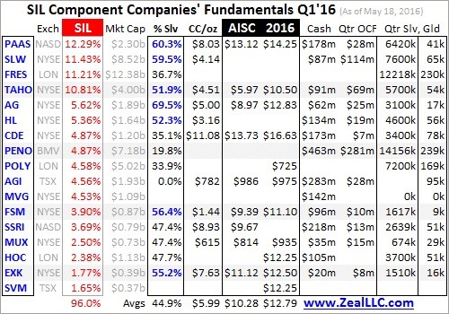 But since there aren’t that many silver miners out there, SIL also includes 9 of SLVP’s 10 holdings.  As of the middle of this week, this flagship SIL silver-stock ETF had 21 holdings.  SIL is the leading way for stock investors to invest in silver stocks today.  I painstakingly analyzed the top 17 of these component companies’ Q1’16 quarterly reports this week, which collectively accounted for 96.0% of SIL’s total weighting.