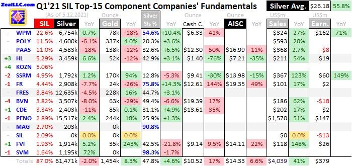 This table summarizes the operational and financial highlights from the SIL top 15 during Q1’21. These major silver miners’ stock symbols aren’t all US listings, and are preceded by their rankings changes within SIL over the past year. The shuffling in their ETF weightings reflect changing market caps, which reveal both outperformers and underperformers since Q1’20. The symbols are followed by current SIL weightings.