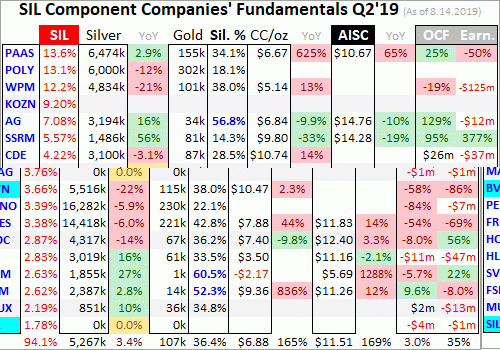 But analyzing them in the aggregate is essential to understand how they are faring. So each quarter I wade through all available operational and financial reports and dump the data into a big spreadsheet for analysis. Some highlights make it into this table. Blank fields mean a company hadn’t reported that data by mid-August, as Q2’s earnings season wound down. Some of SIL’s components report in gold-centric terms.