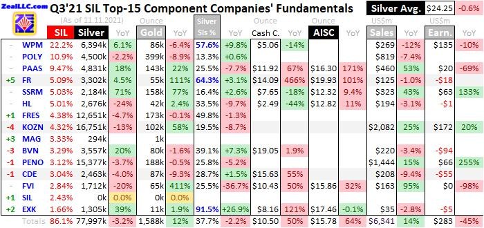 This table summarizes the operational and financial highlights from the SIL top 15 during Q3’21. These major silver miners’ stock symbols aren’t all US listings, and are preceded by their rankings changes within SIL over this past year. The shuffling in their ETF weightings reflects changing market caps, which reveal both outperformers and underperformers since Q3’20. Those symbols are followed by current SIL weightings.